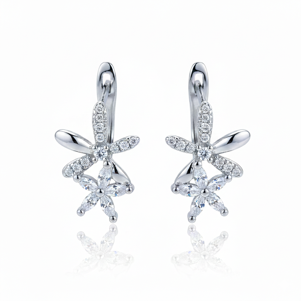 Sparkling with the precision of hand-set American Diamonds, these floral drops offer a contemporary take on classic botanical elegance. Each earring features two stacked blossom motifs, one rendered in polished silver-toned metal and pavé accents, and the other in brilliant marquise-cut stones, suspended from a sleek huggie hoop.