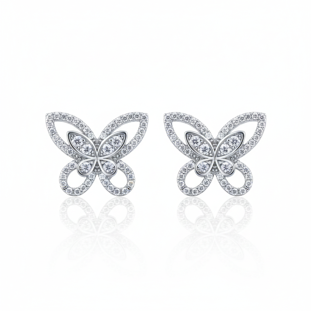 The Flutter Muse Studs are a shimmering tribute to transformation and grace. Meticulously crafted with hand-set American Diamonds, these earrings feature a layered butterfly silhouette that balances delicate openwork with high-brilliance pavé detailing. Their symmetrical, silver-toned frame captures light with every turn, offering a whimsical yet polished aesthetic.