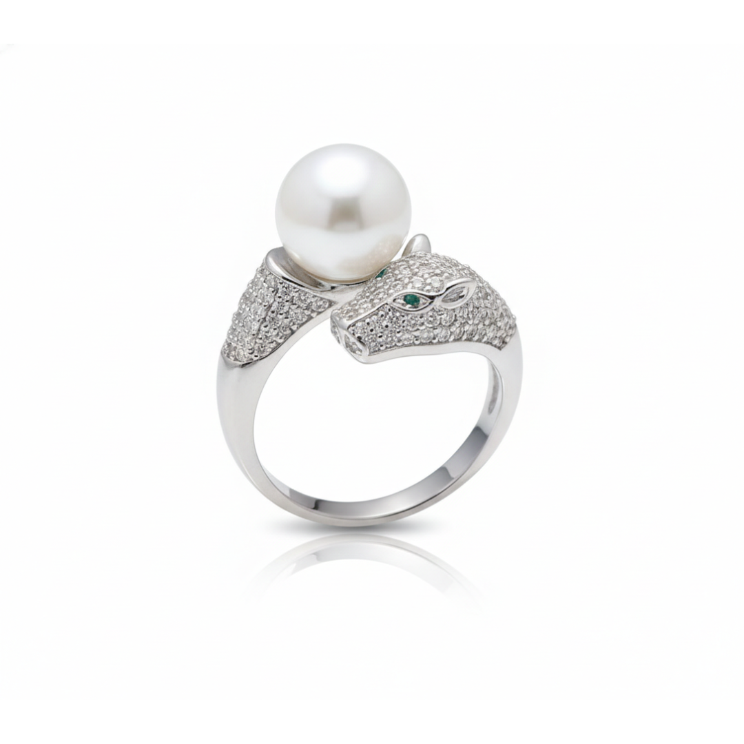 Unleash your inner strength with this masterfully crafted bypass ring. Featuring a finely detailed leopard head encrusted with shimmering pavé-set crystals and piercing emerald-green eyes, this piece is the ultimate statement of power and grace. The sleek silver-plated band curves elegantly around the finger, culminating in a single, high-luster pearl for a touch of timeless sophistication.
