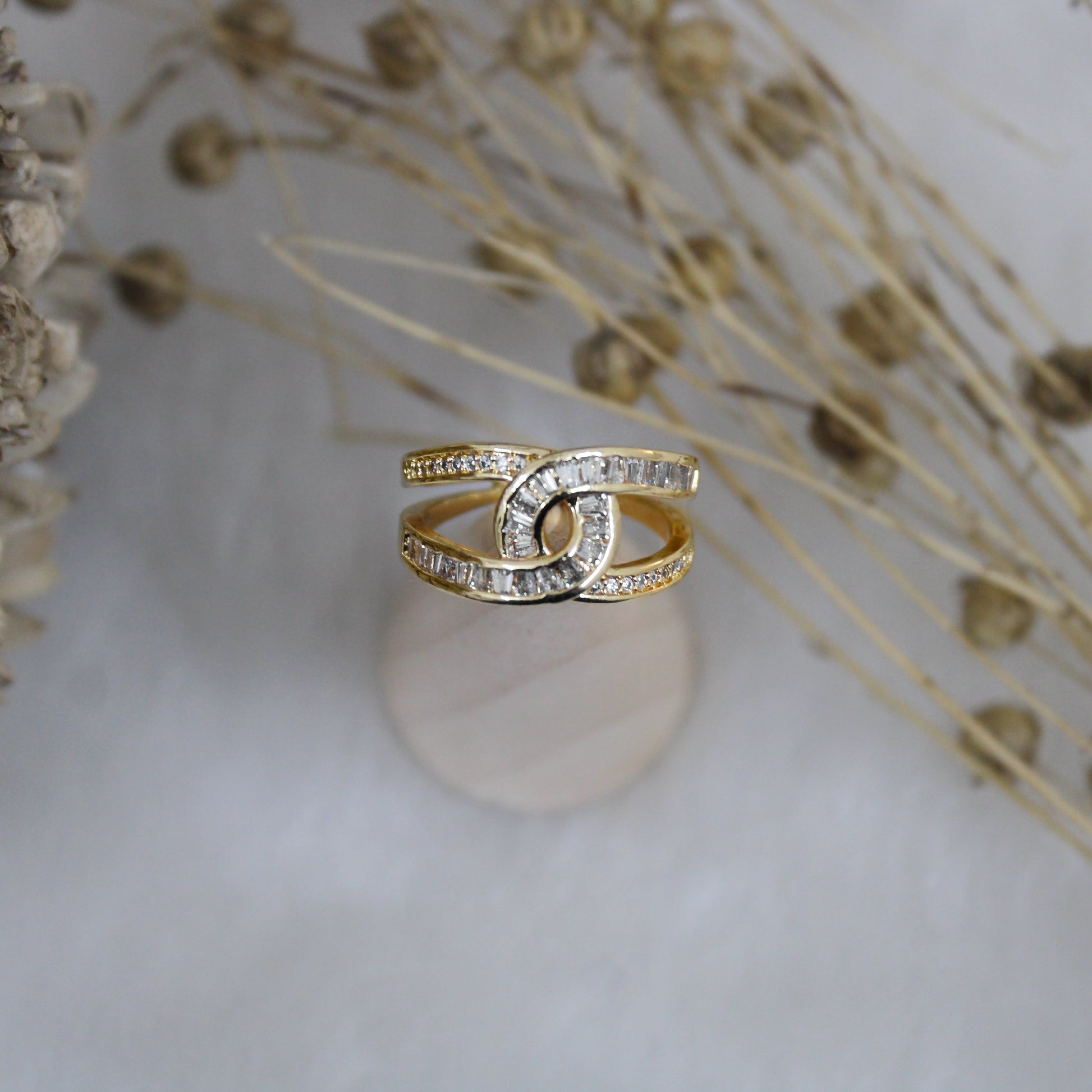 The Contour Link Ring features interlinked 18K gold-plated bands set with shimmering baguette-cut American Diamonds, creating a flowing, sculptural silhouette.